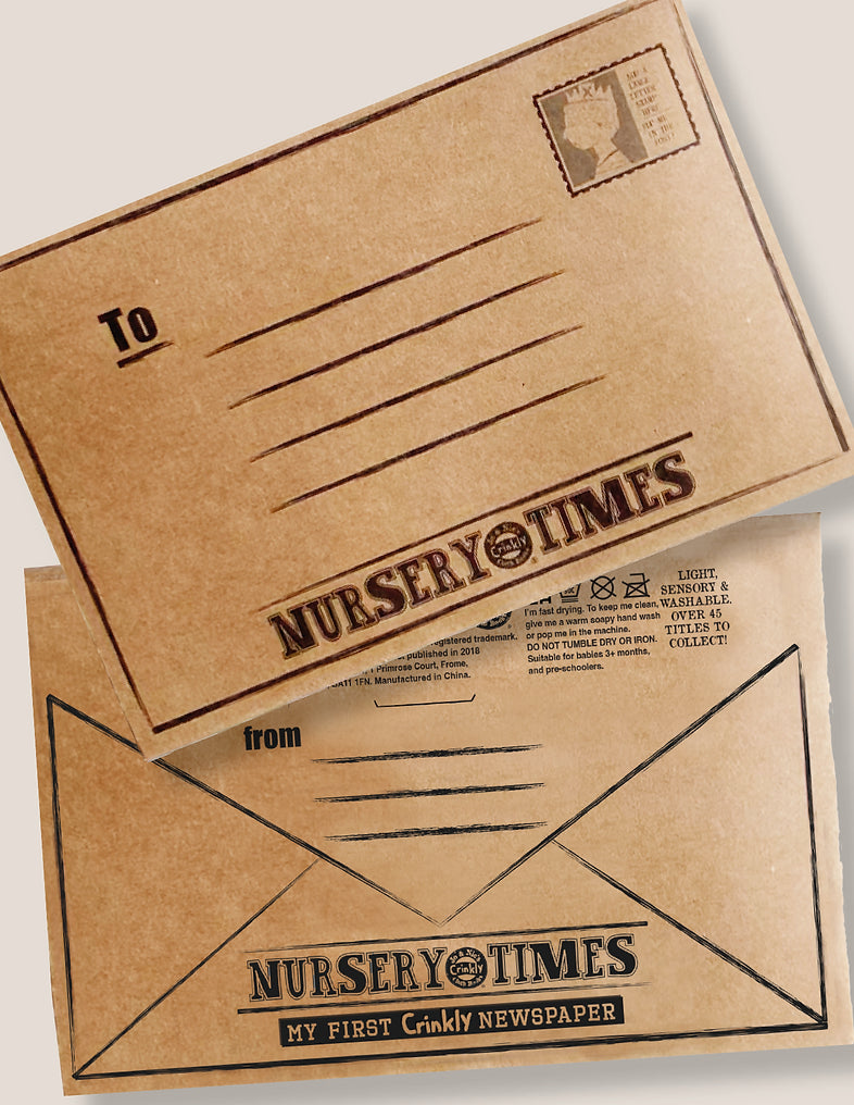 A six page crinkly cloth book designed to look like a little newspaper. Safety tested to UKCA standards. Each newspaper comes packed in a little envelope. There's a space to write To and From making it the perfect unique gift. Add a large letter stamp to send in the post.